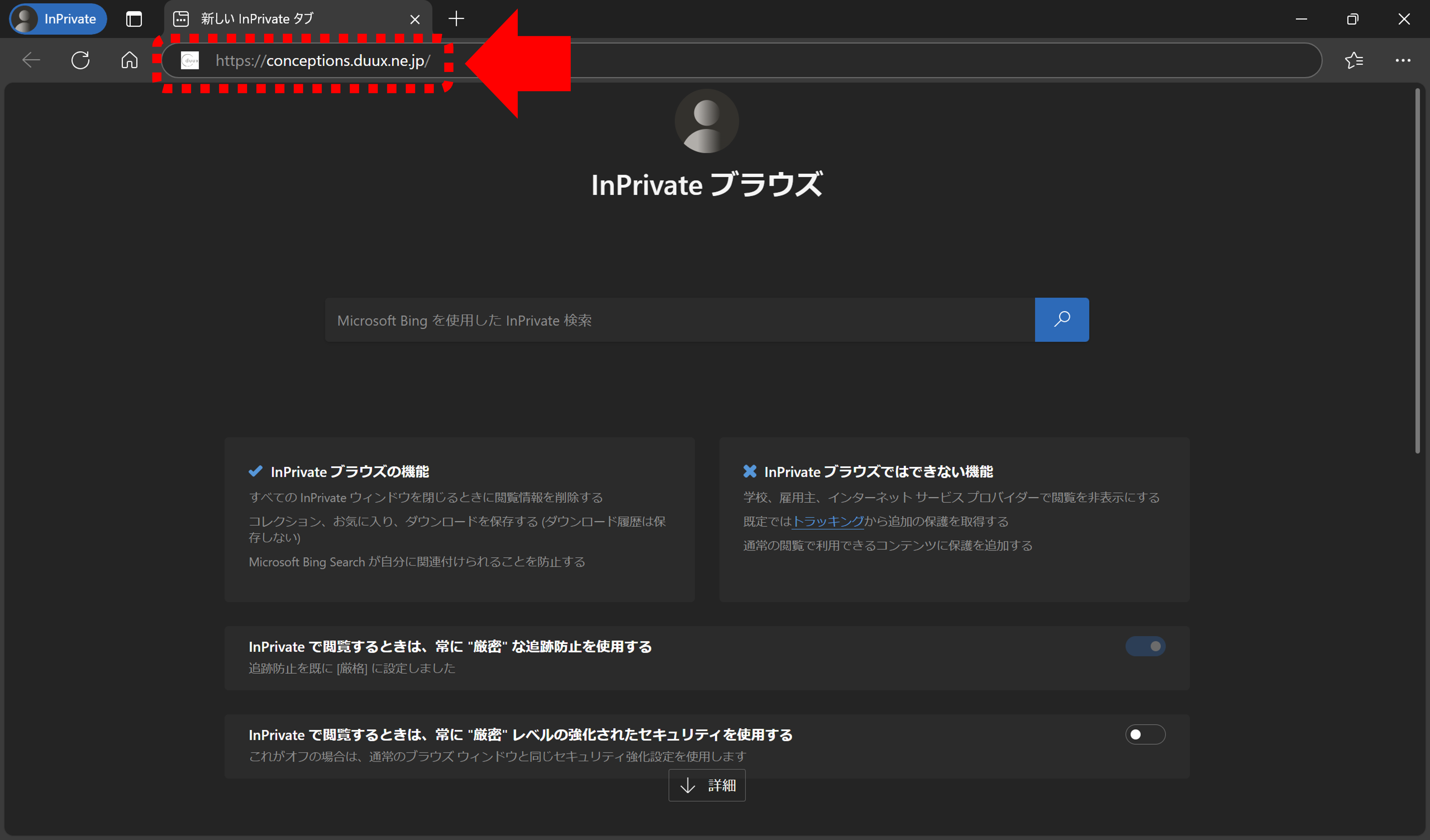 - 「InPrivate ブラウズ」(プライベートモード)が開きます。